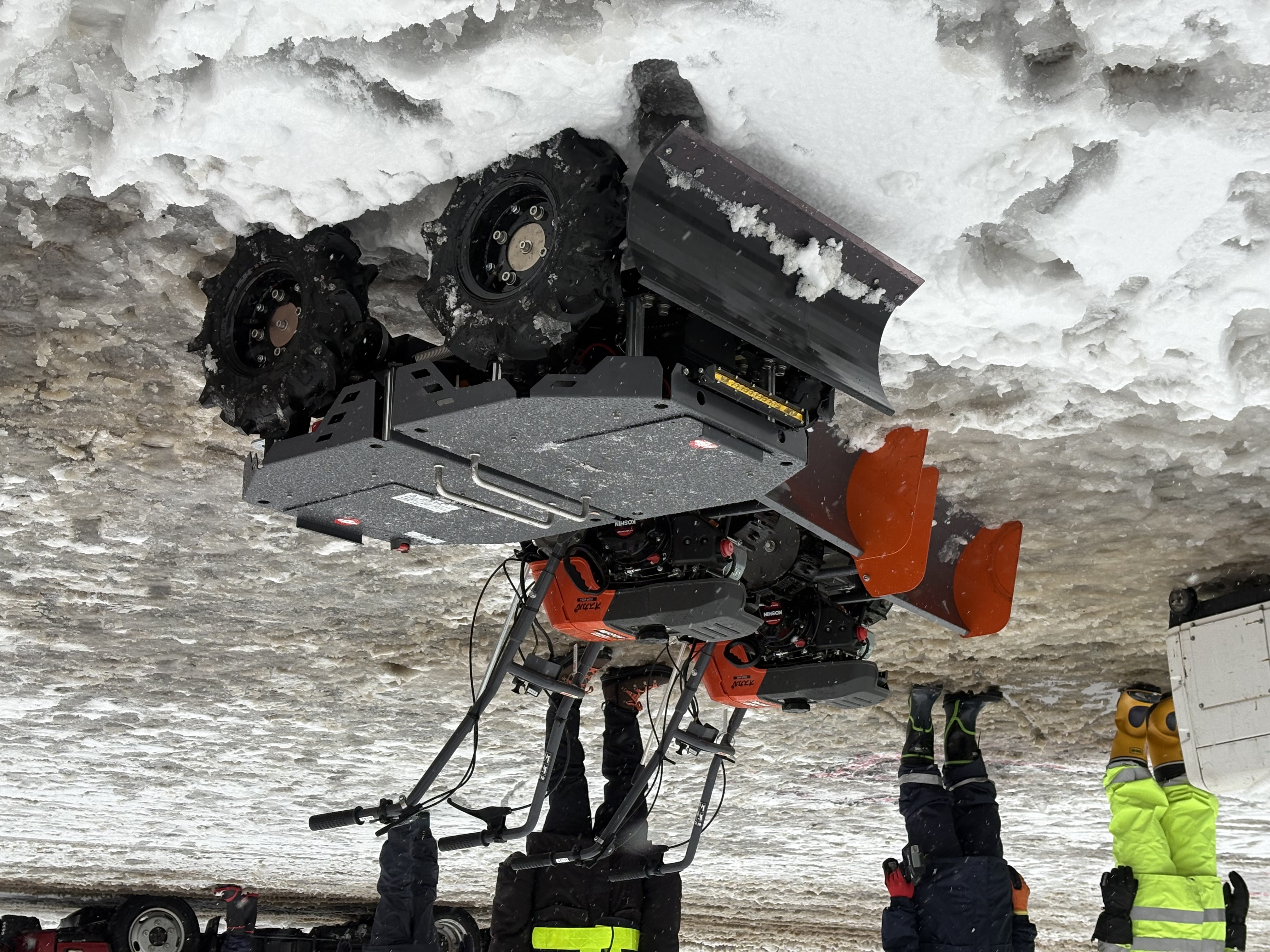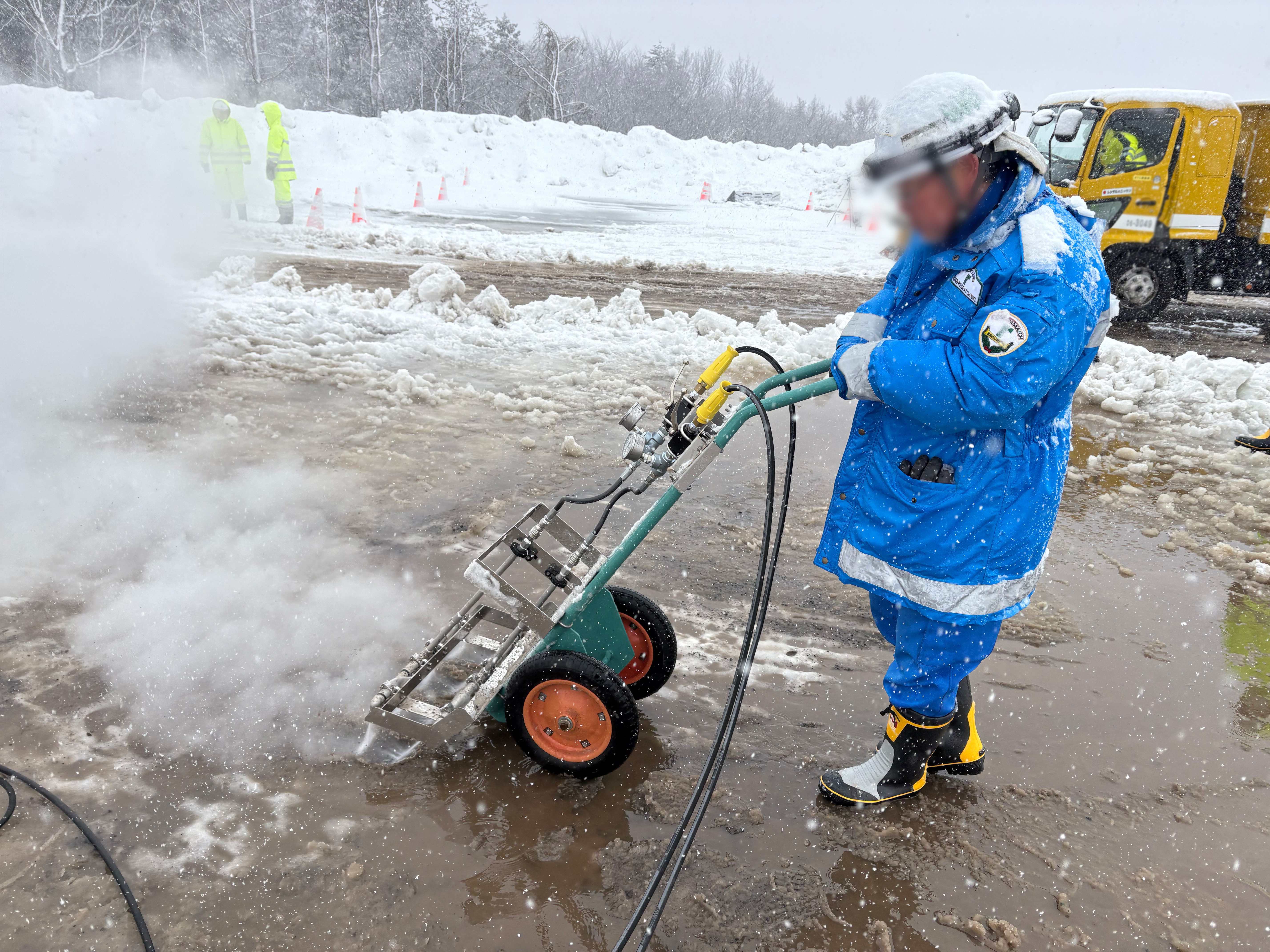 本訓練では、降雪地帯にて実際の雪を使用し、本線および出入口における【除雪 → 排雪 → 融雪(仕上げ)】までの一連の作業を実践しました。